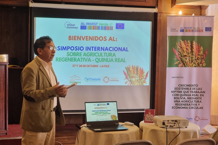 On October 27 and 28, 2025, the International Symposium on Regenerative Agriculture – Royal Quinoa was held in Bolivia, a space developed within the framework of the AL-INVEST Green Program in Bolivia, financed by the European Union: “Sustainable growth of MSMEs working with Royal Quinoa in Bolivia, through regenerative agriculture and circular economy”